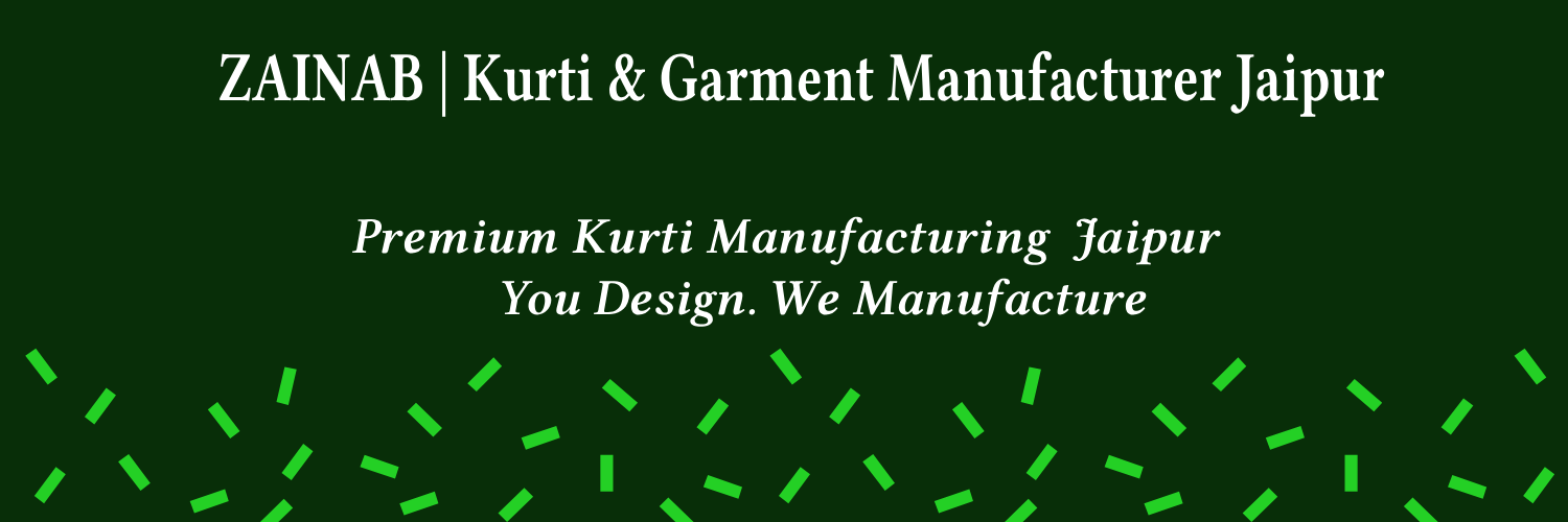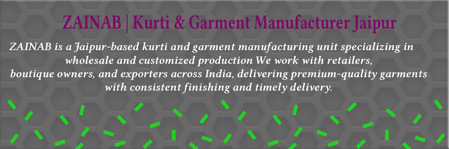 ZAINAB Garments is a trusted kurti and garment manufacturer based in Jaipur, Rajasthan. We specialize in wholesale and customized production of premium-quality cotton kurtis, palazzo sets, and elegant anarkali suits.
