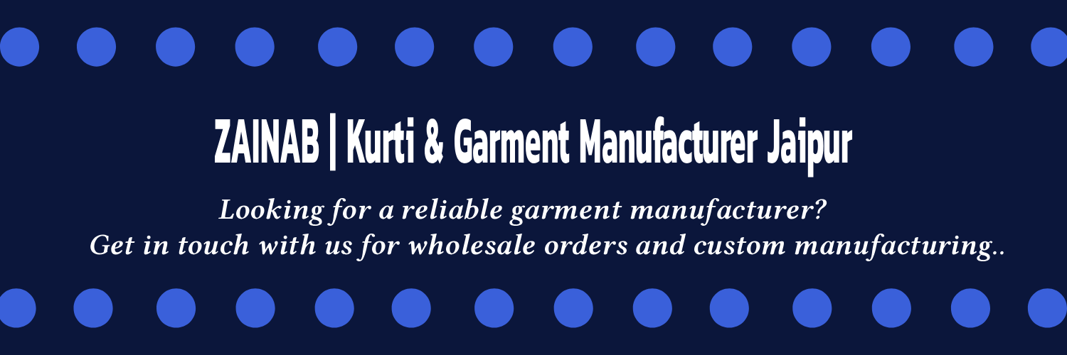 Looking for a reliable kurti manufacturer in Jaipur? Contact ZAINAB Garments for bulk orders, custom designs, and private label production. We ensure premium quality, competitive pricing, and timely delivery across India.
